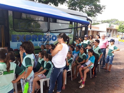 Quem esteve frente ao Acervo Profª Laurides Assis de Lucena, na Praça Alberto Romero em São Jorge do Patrocínio na quinta-feira, 22, pôde ver um ônibus estacionado, onde monitores recebiam os visitantes e distribuíam folhetos informativos sobre a água e sistemas de tratamento. Tratava-se do Eco Expresso do Projeto Do Rio ao Rio, desenvolvido pela SANEPAR, onde a cidade recebe a visita de um ônibus especialmente preparado para exibir, por meio de maquete, o ciclo da água e os processos de tratamento da SANEPAR, incentivando a preservação do meio ambiente, em especial dos recursos hídricos. A visitação é gratuita. Esteve presente na abertura dos trabalhos o vice-prefeito Ronaldo Tinti, o secretário de Meio Ambiente Ronaldo Bunzel, a fiscal ambiental Aline Resende, equipes ambientais e alunos. O prefeito José Carlos Baraldi também visitou as instalações, onde enalteceu o trabalho da SANEPAR em parceria com entidades ambientais. "Educar hoje as crianças para os cuidados com a água é muito importante para que se preserve no futuro", afirmou o prefeito. Durante o dia de visitas, os alunos das escolas municipais, Espaço Criança e Grupo de Melhor Idade puderam observar por meio da maquete, o caminho que a água percorre até chegar às torneiras dos moradores e depois retornar ao rio, na forma de esgoto tratado. Os cuidados para destinar os resíduos sólidos e a geração de energia elétrica a partir do processo de tratamento de esgoto também são temas da maquete. O projeto Eco Expresso foi criado pela Sanepar em 2014, e desde então tem tido destaque em todo o Paraná como ferramenta pedagógica de educação ambiental. Ao final da visita, todos foram presenteados com copos do Projeto em celebração ao Dia Mundial da Água.