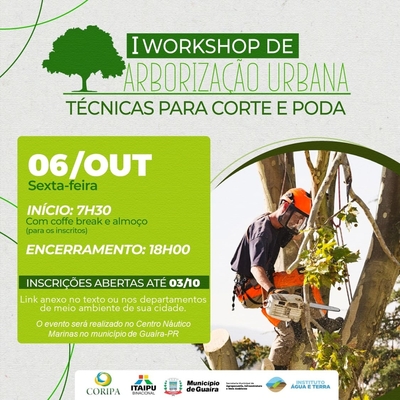 O "I Workshop de Arborização Urbana - Técnicas para Corte e Poda" irá acontecer no próximo dia 06 de outubro no Centro Náutico Marinas no município de Guaíra. As inscrições poderão ser realizadas até o dia 03 de outubro.