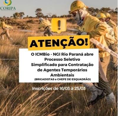 O Instituto Chico Mendes de Conservação da Biodiversidade ICMBio - NGI Rio Paraná está com inscrições abertas para contratação de brigadistas e chefe de esquadrão para compor as brigadas de prevenção e combate a incêndios florestais, realização de atividades relacionadas ao manejo integrado do fogo e apoio operacional.